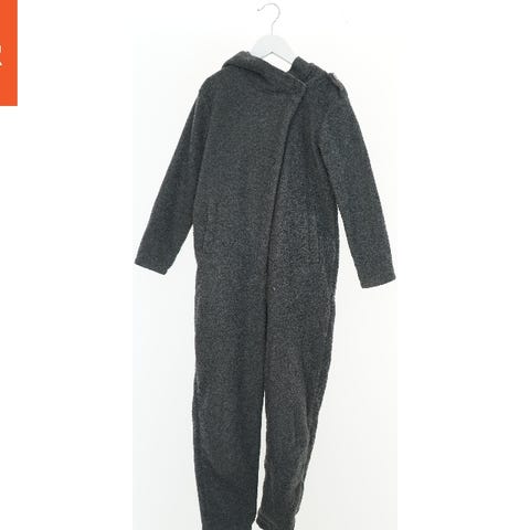 En grå heldragt med lange ærmer og hætte. Dragten har en lynlås foran og sidelommer. Stoffet ser varmt og komfortabelt ud.