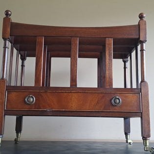 Elegant antik Canterbury fremstillet af massivt mahogni-træ, oprindeligt fra England. Forsynet med et klassisk korsbinding med dekorativt medaillon og en praktisk skuffe med messing trækkknapper. Står på drejede ben med originale messinghjul.