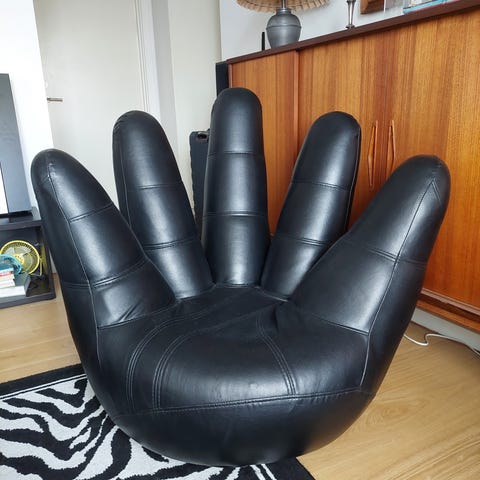 Forestil dig en hånd, stor nok til at kunne sætte sig på, med fingrene elegant i balance som om de ventede din ankomst. Hånden er sædet, og fingrene buer sig for at danne en behagelig ryglæn. Dette design har en slags menneskelighed: en hånd, der strækker sig ud klar til at omfavne dig, opmuntrer dig til at sætte dig og lade dig opsluges af dens surrealitet. Hand Chair i stil med Pedro Friedeberg er den ekstravagante drøm for dem, der altid har ønsket sig et møbelstykke, der bogstaveligt tildeler dig hånden.