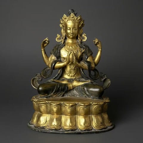Groene Tara 32,5 cm, en forgyldt bronze-statue fra Asien, højde 32,5 cm, bredde 20 cm, dybde 19 cm, signeret, i god brugt stand med alders tegn og meget fint detaljeret. Klik på den blå "gå til varen" knap, for at købe eller byde på denne vare. Den samlede pris vil blive vist inden du afgiver dit bud.
