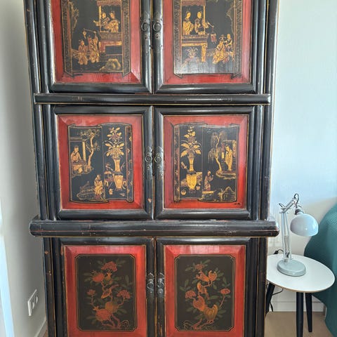 Dette imponerende skab blev traditionelt brugt i en tempel- eller helligdomssammenhæng, sandsynligvis til opbevaring af rituel udstyr, ofringer eller hellige genstande.