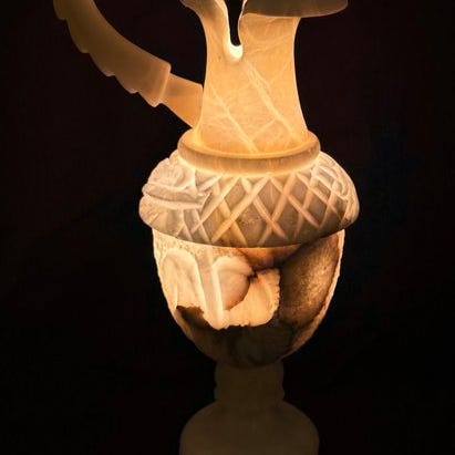 Lampen på billedet er en klassisk alabast bordlampe i form af en vase eller urne med håndtag. Dette lampetype er kendt for den varme, stemningsfulde glød, der opstår, fordi lyset trænger gennem den naturlige, lysgennemtrængelige sten.