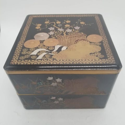 Japansk lakeret træ jikiro konfektkasse af Nakamura Souetsu (1900–2000) med kanaami‑me gyldent netsmønster på sort kuro-urushi-lakering, mål 20 cm bred, 20 cm dyb og 13 cm høj (694 g), i god stand, leveres med original tomobako opbevaringsboks. Klik på den blå "gå til varen" knap, for at købe eller byde på denne vare. Den samlede pris vil blive vist inden du afgiver dit bud.