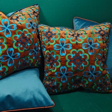 seks håndlavede dekorative puder i Corals-stof fra Manufatti Toscani, fire 42x42 cm og to 36x36 cm, pudeindhold inkluderet, bagside i velour, fremstillet i Toscana, Italien, 2023, i næsten som ny stand. Klik på den blå "gå til varen" knap, for at købe eller byde på denne vare. Den samlede pris vil blive vist inden du afgiver dit bud.