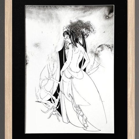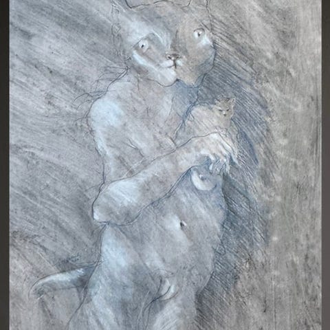 • Teknik: Tegning i sanguine med hvidtindslag på papir med grov kornstruktur og marmorering, drejende linjer, ekspressive lag og sculptural formgivning