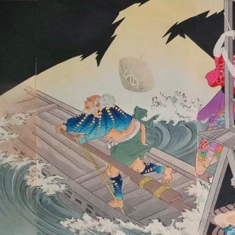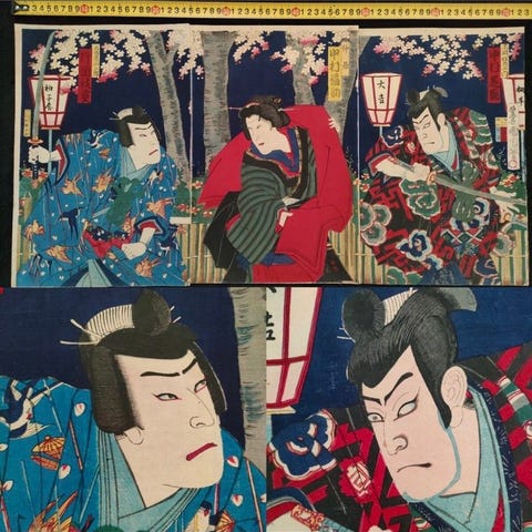 En japansk træsnits fra det 19. århundrede af Utagawa Kunisada, med titel Triptych, kabuki-scene - Kagekiyo's daugther Jinmaru - 1856, Edo-perioden, 72 × 36 cm, pladesigneret og i restaurering. Klik på den blå "gå til varen" knap, for at købe eller byde på denne vare. Den samlede pris vil blive vist inden du afgiver dit bud.