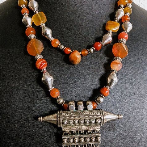 Indienr Origin Collier med flere strenge inspireret af indisk stil, blå perler der efterligner lapis lazuli og sølvdetaljer, samlet vægt ca. 84 g, samlet længde ca. 55 cm med ca. 25 cm perlerdel, snor med let slid, i pæn brugts stand. Klik på den blå "gå til varen" knap, for at købe eller byde på denne vare. Den samlede pris vil blive vist inden du afgiver dit bud.
