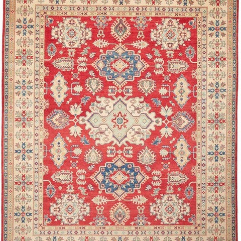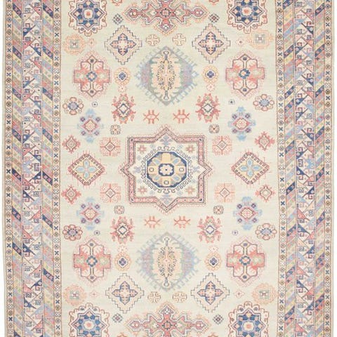Kazak-tæppet er håndknyttet i Afghanistan, og designet er inspireret af russiske og kaukasiske geometriske mønstre.