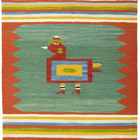 Helt vævet i hånd i naturlig uld, i traditionelle farver (rød, brun, orange, grøn, elfenben).