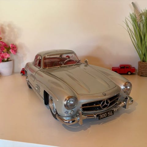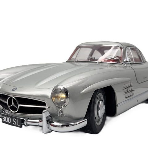 Denne store og tunge model af 300 SL Gullwing blev udsolgt meget hurtigt og tilbydes sjældent igen. Kun 500 eksemplarer af denne model verden over (500 / 195 lande = 2,56 modeller per land - en virkelig sjældenhed). High-end modellen består af over 300 enkelte dele, som er samlet i hånden til højeste kvalitet. Modellen er som ny i perfekt mint-tilstand. Meget smuk og lavet af materialer af høj kvalitet. Den har mange bevægelige dele (gullwing-døre, motorhjelm og bagklap kan åbnes) mange smukke detaljer (detaljeret interiør ned til det