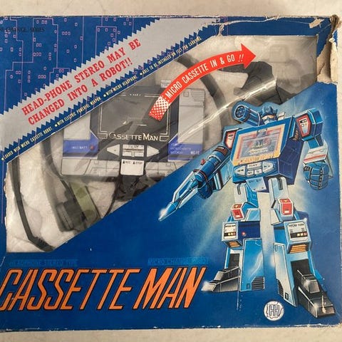 Transformers Sixshot & Soundwave. Direkte fra begyndelsen af 80’erne, to af de mest ikoniske Decepticons i G1-serien. Sixshot, robot-ninjaen, i stand til at forvandle sig til 6 forskellige former: Robot, Bil, Tank, Ulv, Jet, Lasergevær. I perfekt stand. Fuldt udstyret med våben og klistermærker. Soundwave (denne første version hed Cassette Man), roboten i stand til at forvandle sig til kassetteafspiller, med inkluderet en mini kassette-robot, der kan forvandle sig til en grib. Den sidstnævnte er lidt beskadiget. Tiden har slidgivet brud på gribbens ben, netop mens jeg var ved at forvandle den til billederne. For resten er Soundwave i god stand, inklusive bazooka, taget i betragtning at den er mere