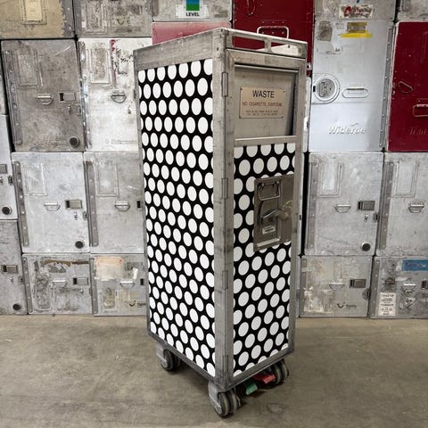 Driessen aluminium cateringvogn, forenet af AF Customs med et VW Beetle pop-art design, brugt af TAP Portugal og i rimelig stand med muligt manglende små dele, vægt 29 kg, mål 104 cm høj, 30 cm bred og 81 cm dyb, med fire plast Atlas skuffer og to tørisbakker, hjul og fodbremser fungerer, produceret i Nederlandene (2010–2020). Klik på den blå "gå til varen" knap, for at købe eller byde på denne vare. Den samlede pris vil blive vist inden du afgiver dit bud.