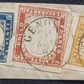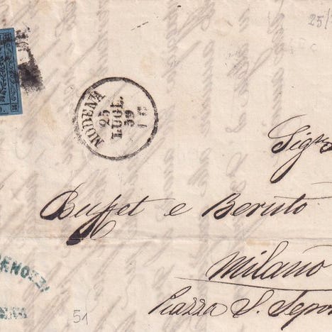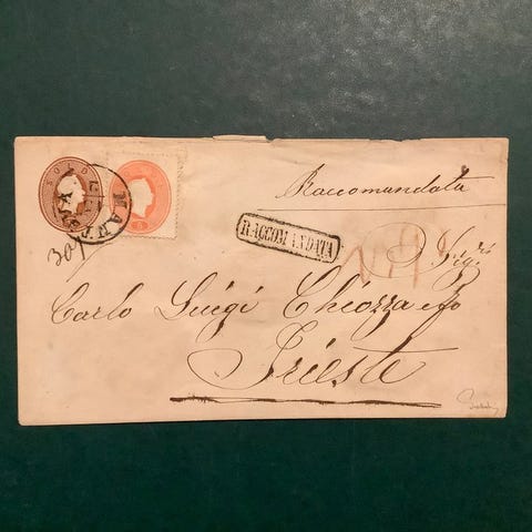Brev fra Venedig til Milano med den sjældne takst på 18 Soldi, sammensat af et tre- og et 15 Soldi-frimærke af typen TyII; det særlige ved dette brev er, at det blev sendt via søvejen gennem Sardinien, hvilket forklarer den usædvanlige frankering