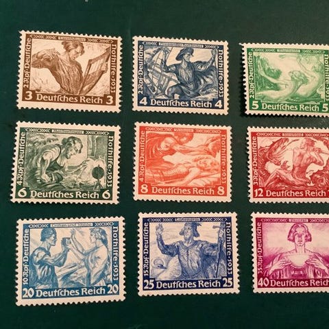 Geografisk oprindelse: Det Tyske Rige, frimærke med titlen “Beroemde Duitsers - MNH”, postfrisk, Michel 385/397, ældste frimærker fra 1926, katalogværdi €1.100 (Michel 2022). Klik på den blå "gå til varen" knap, for at købe eller byde på denne vare. Den samlede pris vil blive vist inden du afgiver dit bud.
