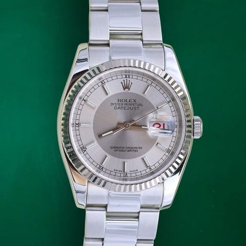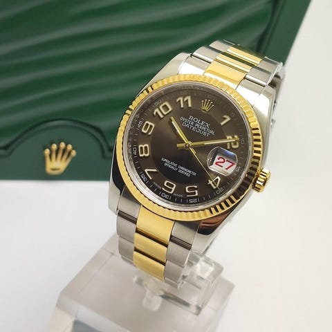Urkassen er 36 mm i 18 karat guld og er parret med et langt originalt guldarmbånd. Med en samlet vægt på 117 gram tilbyder uret også alsidigheden ved et andet læderarmbånd med Rolex-spænde.