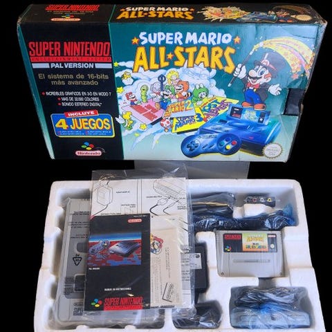 Nintendo SNes Super Nintendo-konsol fra 1992 i god stand, i funktion, med originalemballage, udgave 16B af Super Mario World. Klik på den blå "gå til varen" knap, for at købe eller byde på denne vare. Den samlede pris vil blive vist inden du afgiver dit bud.