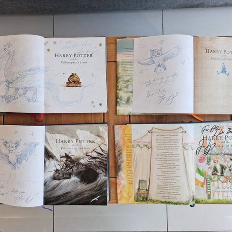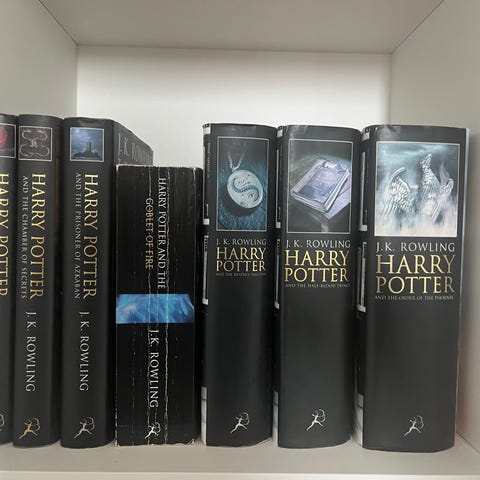 Harry Potter-sagaen i komplet sæt: 4 første tryk og 3 med rød skrift, 1. udgave.