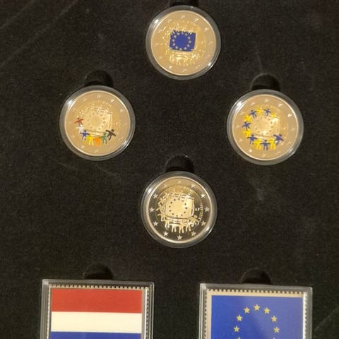 Total: 27 sæt × 5 mønter = 135 mønter, alt opbevaret i