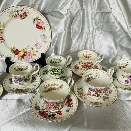 Smuk samling af service fra det ikoniske engelske topmærke Royal Albert med temaet Flowers of the Month. Serviceet ser stadig fantastisk ud og har ingen chips eller mindre skader. Også de gyldne kanter er stadig af meget høj kvalitet.