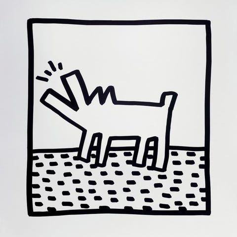 Den bjeffende hund, eller den grinende hund, er et af Keith Haring’s mest populære motiver. Hunden i 'Untitled (DJ)' er placeret bag en pladespiller og holder en plade i den ene hånd. Haring blev i høj grad inspireret af musikken i sin generation, hvor hiphop opstod i New York omkring det samme tidspunkt som kunstnerens værker begyndte at få berømmelse.