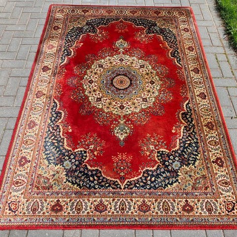 Europaisk produceret maskinsyet tæppe af uld på bomuld, gul baggrund med centralt klassisk medaillon og orientalskinspireret kant, 230 x 170 cm, ca. 7 kg, fra slutningen af det 20. århundrede, i god brugt stand. Klik på den blå "gå til varen" knap, for at købe eller byde på denne vare. Den samlede pris vil blive vist inden du afgiver dit bud.
