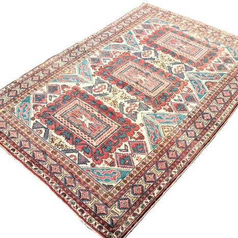 Smukt vintage tæppe med et kraftigt geometrisk mønster i traditionel Kazak-stil. Tæppet fanger blikket med sine varme røde nuancer kombineret med beige, blå og jordfarver, hvilket giver et tidløst og dekorativt udtryk.