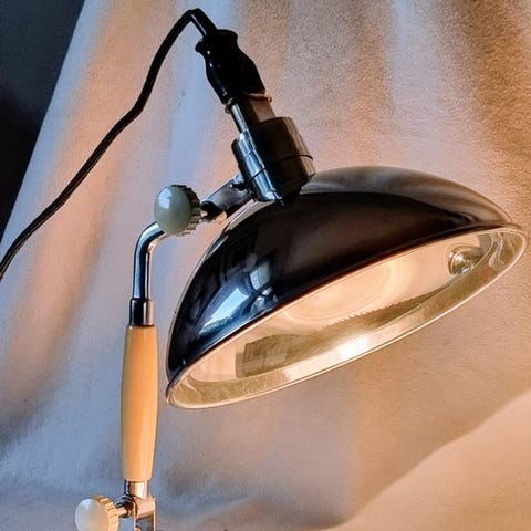 TiWo-Design/Horo original upcycle bordlampe 'Horo', model Laborbrenner, fremstillet i Tyskland, i fremragende stand med minimale brugssignaler, fod af emaillieret metal, keramisk søjle og rustfrit stålstativ, E14-fatning med medfølgende pære, cirka 28 cm høj, lampskærm Ø20 cm, fod Ø16 cm, solgt direkte af designeren med TiWo-ægtheidssæde. Klik på den blå "gå til varen" knap, for at købe eller byde på denne vare. Den samlede pris vil blive vist inden du afgiver dit bud.
