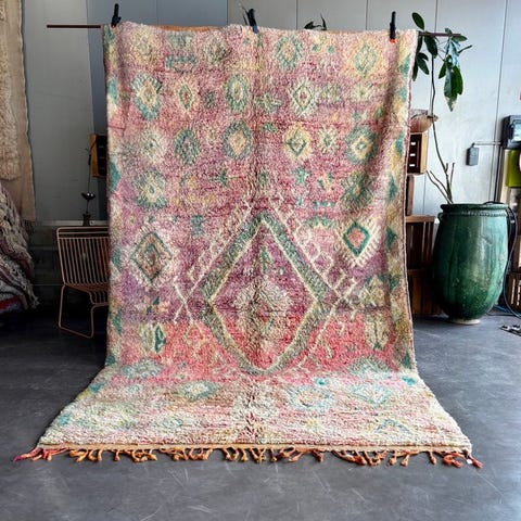 Dette nye håndlavede marokkanske Boujad-tæppe er et unikt uldtæppe vævet af Berber-kunstnere ved hjælp af traditionelle teknikker, der er videregivet gennem generationer. Inspireret af klassiske Boujad-designs forener dette stykke autentisk nomadisk symbolik med en blød, nutidig farvepalet.