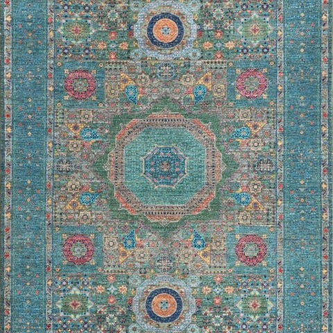 Et pragtfuldt Mamlouk-tæppe, inspireret af de historiske hofdesigns fra det gamle Egypten, håndknyttet med højeste præcision og kunstnerisk følsomhed. Det detaljerede mønster med en imponerende centralt medaillon og kunstfærdigt symmetriske ornamenter giver tæppet en majestætisk udstråling.