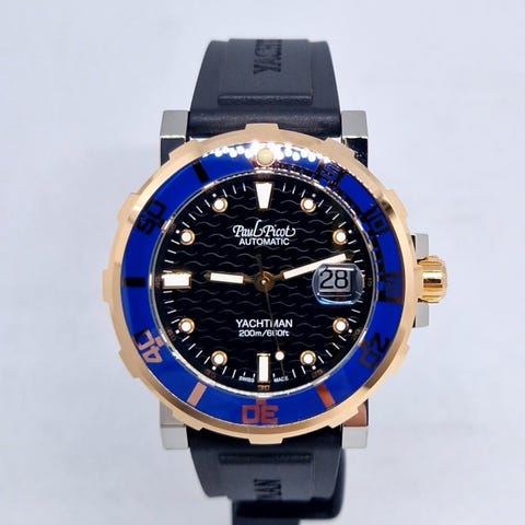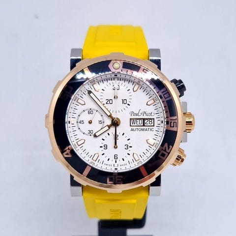Paul Picot Yachtman III Kronograf P1127.SRG.NR.1604.50, automatisk bevægelig, unisex, periode 2000–2010, kasse i guldb og stål 43 mm, rem i gummi, kronograf, dag og dato, vandtæt til 200 m, ny med æske, papirer og toårig officiel garanti. Klik på den blå "gå til varen" knap, for at købe eller byde på denne vare. Den samlede pris vil blive vist inden du afgiver dit bud.