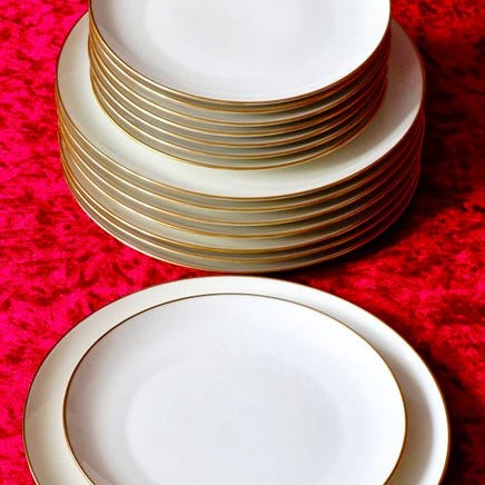 Bestikket er fuldt forgyldt med elegante skaller-formede spidser, der perfekt komplementerer den raffinerede æstetik i porcelænen. Knivene og gaflerne er ikke