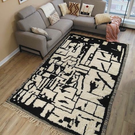 Mistede dit interiør også karakter, men ved du ikke helt, hvad der mangler? Jeg forstår dig. Mine tæpper løser dette problem. Bring varme, stil og autenticitet ind i dit hjem med dette håndstrikkede Berber-tæppe fra Atlasbjergene i Marokko.