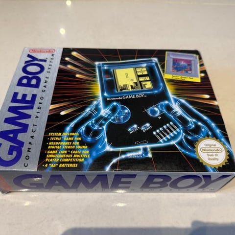 I byder på at byde på en Nintendo Game Boy Classic i originalæsken med Tetris i etui + alle disse hæfter, mangler kun høretelefonerne.
