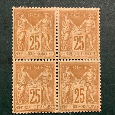 Oprindelse: Frankrig; 50 cent Sage type II i fireblok, postfris, fra 1890, katalognummer Yvert 98. Klik på den blå "gå til varen" knap, for at købe eller byde på denne vare. Den samlede pris vil blive vist inden du afgiver dit bud.