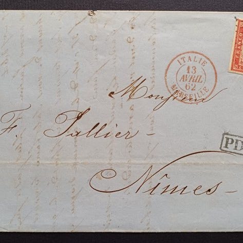 Antikke Italienske Stater - Sardinien - Trefarvet fragment med frimærker, 4. ...