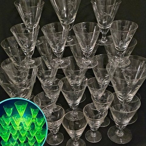 Glasene fluorescerer under UV-lampe på 365 nm, et fænomen der skyldes tilstedeværelsen af mangan anvendt i gamle tider som afblegningsmiddel til krystal, karakteristisk for ældre produktioner