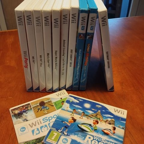 Udover boksen med konsollen og spillet Mario Kart inkluderer jeg en blå controller og to spil.
