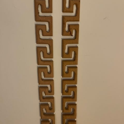 Udskårne trærelieffer som vægdekoration med detaljerede asiatiske motiver. Motiverne viser figurer, heste, bygninger og træer i et lagdelt relief. Reliefferne er udført i træ og fremstår i en gylden/brun nuance. Egnede som dekorative vægpaneler i hjemmet eller som samlerobjekt inden for asiatisk kunsthåndværk.