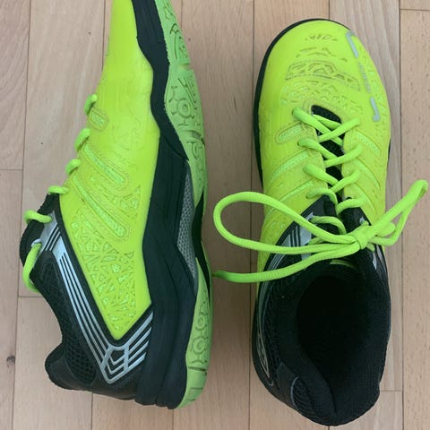 Victor V-CORE badmintonsko i størrelse 42. Skoene er sorte med lyse såler og snørelukning. Overdelen er i syntetisk materiale og mesh, og sålen er mønstret for godt fodfæste på indendørs underlag. Velegnet til forskellige indendørs sportsgrene og træning, hvor der er behov for stabile sportssko med god støtte.