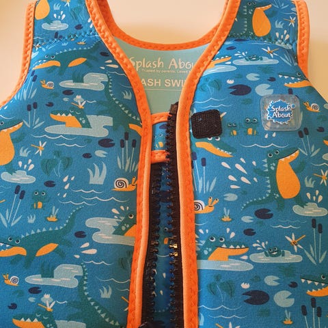 Svømmevest med både lynlås- og velcrolukning. Har en sikkerhedsrem ved skridtet med spænde, så barnet ikke kan glide ud af vesten.