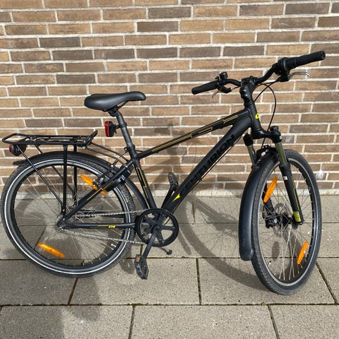 Mustang citybike med 26" hjul i turkis farve. Cyklen har lav indstigning, kurv foran og bagagebærer bagpå. 3 gear køreklar