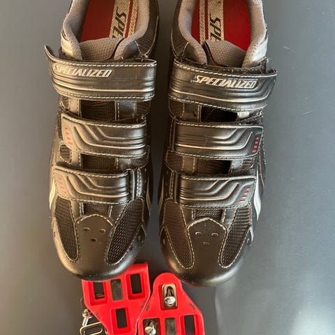 Spinningsko / spinning skoNewline cykelsko i størrelse 41. Skoene er sorte med lyse/grå detaljer og lukkes med tre velcrostropper over foden. Overdelen er en kombination af syntetisk materiale og mesh for ventilation. Velegnet som cykelsko til brug med klikpedaler, afhængigt af hvilken klampe der monteres under sålen.