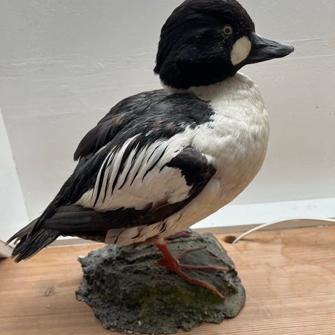 Udstoppet and på træfod. Fuglen er monteret i en naturlig positur med udbredt vinge og står fastgjort på en formet træbase. Farverne er mørkebrune og sorte nuancer med lyse fjer på bug og vinger. Egnet som dekoration, undervisningsmateriale eller samlerobjekt inden for jagt- og naturhistoriske effekter.