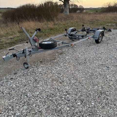 Bådtrailer i rødmalet stålramme. Traileren har kraftig svejset konstruktion med flere tværgående rammer og justerbare støttebukke i begge ender. Udstyret med tvillingehjul på akslerne og ledningstræk til evt. lys langs rammen. Egnet som opbevarings- eller havnetrailer til større både, hvor båden understøttes af rammens stolper og tværvanger. Traileren fremstår som en tung, åben stålramme uden sider eller lad.