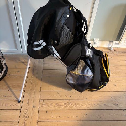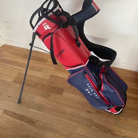 Elrey golfbag standbag i rød og hvid. Tasken har bæreseler og integreret benstativ, så den kan stå selv på banen. Øverste åbning er inddelt i flere rum til køller. Der er flere lynlåslommer på siderne til opbevaring af bolde, handsker og andet udstyr. Leveres med tilhørende regn- eller støvhætte, som kan monteres over toppen af bag’en. Velegnet som let bærebag til golfudstyr.