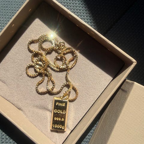 Aarikka halskæde til kvinde i forgyldt materiale. Halskæden har et rektangulært, hamret vedhæng i forgyldt metal og en fin kæde i samme farve. Smykket er egnet til daglig brug eller som enkelt tilbehør til mere formelle anledninger.
