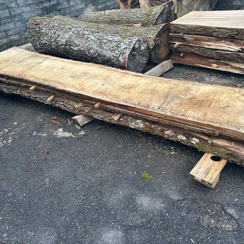 Massivt træ planker med naturkant. Plankerne har synlig åretegning og varierende bredde langs længden. Velegnet til eksempelvis bordplader, hylder eller andre snedker- og gør-det-selv projekter, hvor der ønskes et rustikt udtryk. Træet fremstår ubehandlet og kan efterbehandles efter behov med olie, lak eller anden overfladebehandling. Bredde mellem 20 og 25 cm. Længde 2,40 meter. Tykkelse 3 cm. Sælges samlet