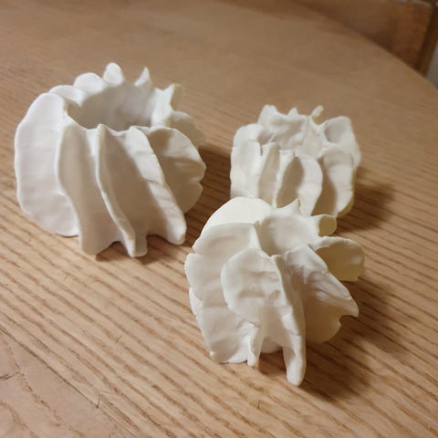 Bestikholdere i porcelæn med hvid glasur og blåt dekormønster. Sættet består af 7 holdere, der er formet til at bære kniv og gaffel, så bestikket ligger hævet fra bordfladen. Velegnet til borddækning, hvor man ønsker at holde bestik rent og adskilt fra underlaget. Tænker det oprindeligt er til spise pine. 7 stk.