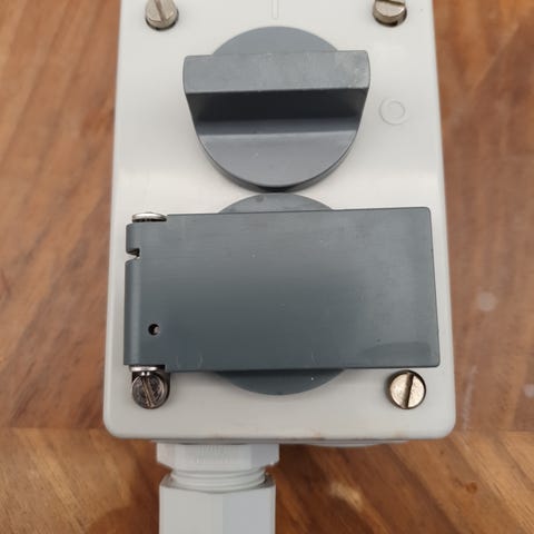 Vi har 1 stk. ældre LK udendørs drejeafbryder 1 pol afbryder med en ekstra skrueterminal og der medfølger et underlag til den.