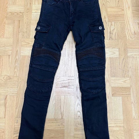 Yoko bukser i størrelse S. Bukserne er sorte og fremstillet i et materiale bestående af 90 % polyester og 10 % nylon med polyesterfor. De har forstærkede knæpartier og lynlås ved benafslutningerne samt velcrojustering i taljen og ved benene. Velegnede som yderbukser til udendørs brug, f.eks. motor- eller cykelsport.